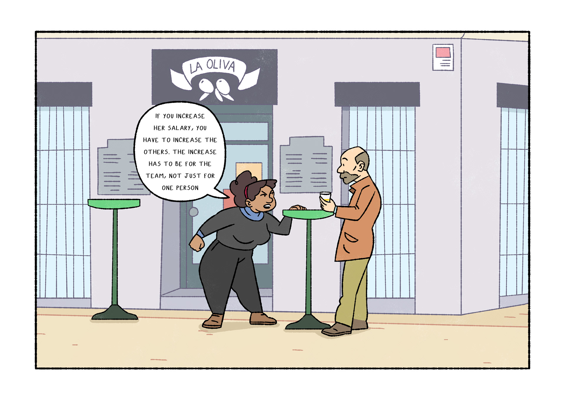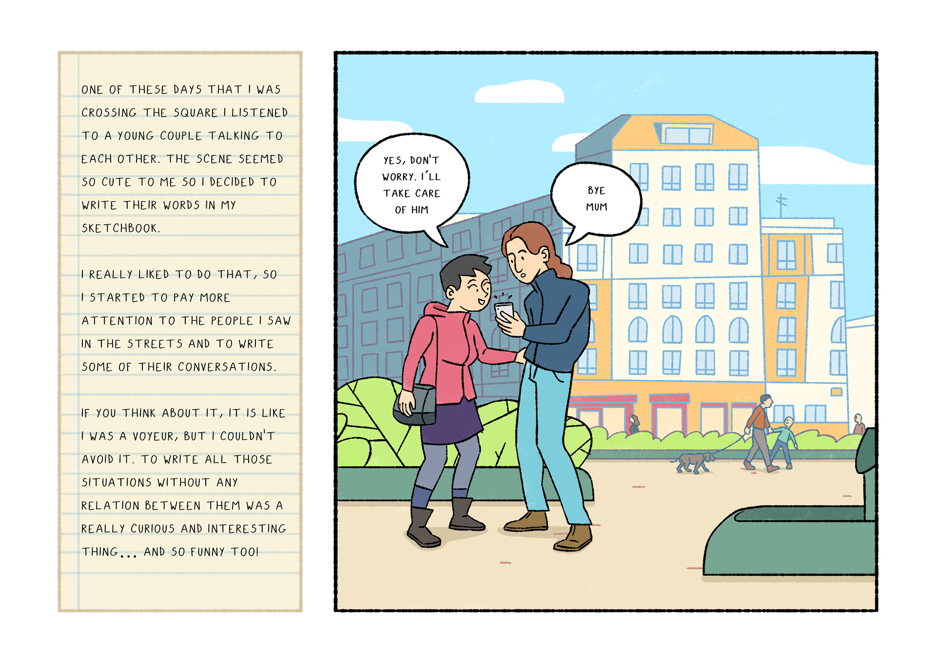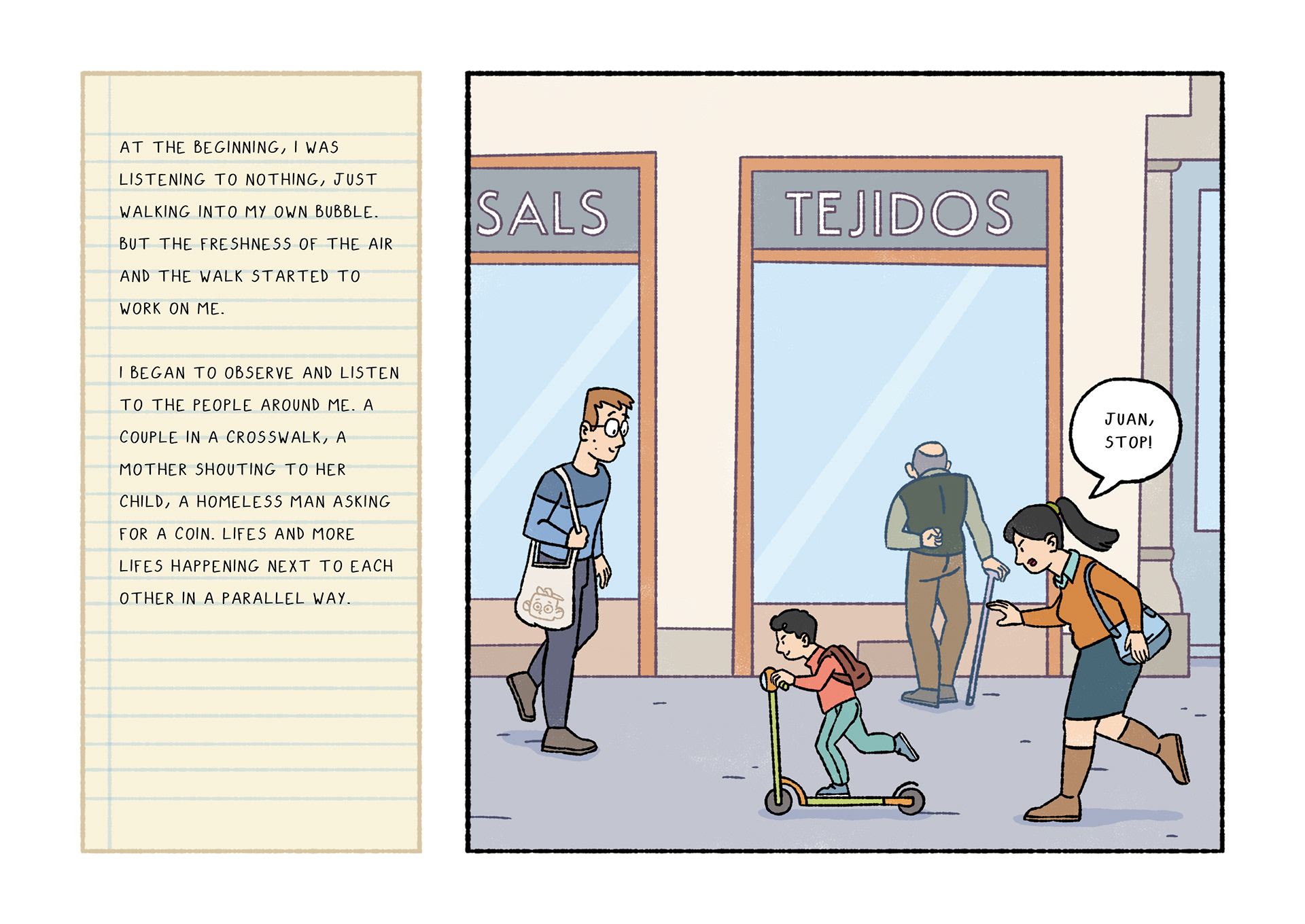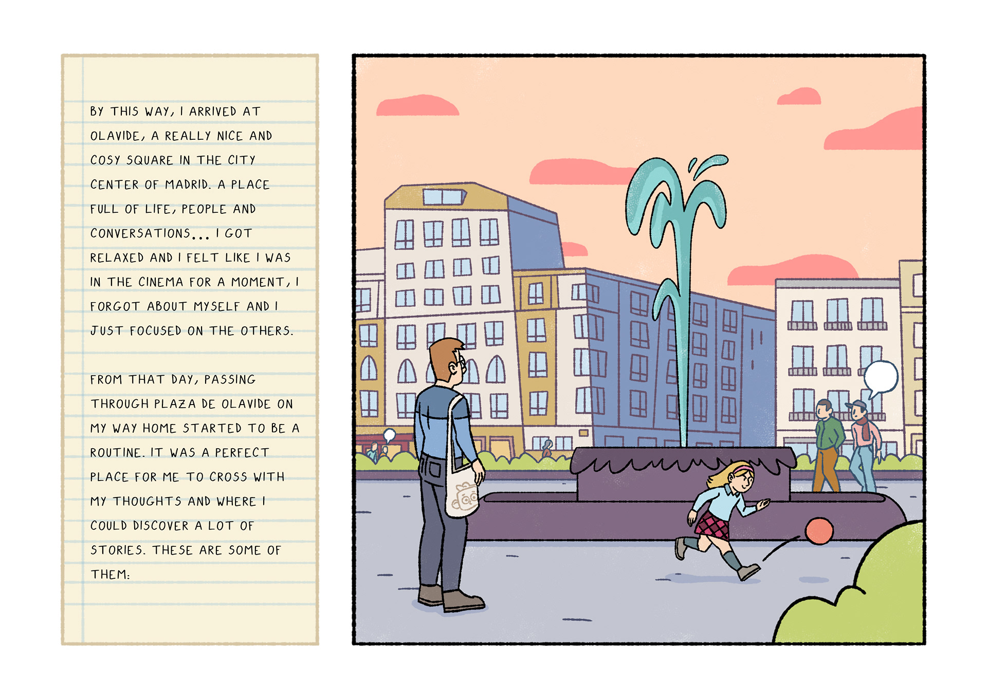 Olavide is a comic which portraits daily life. Each page shows a real conversation or sentence I listened on the street. After selecting 120 and chose Plaza de Olavide as the perfect scene, I started to draw them.