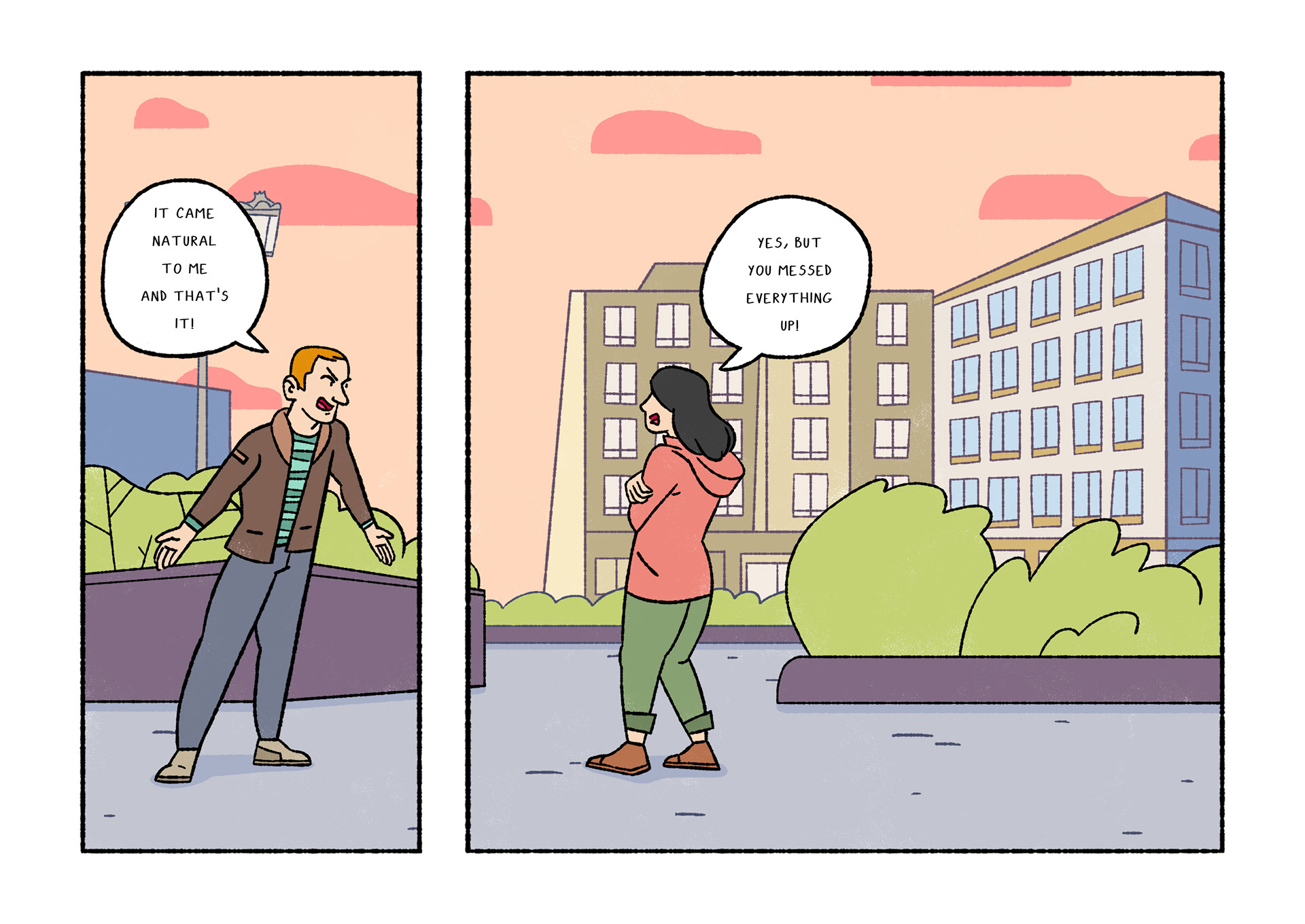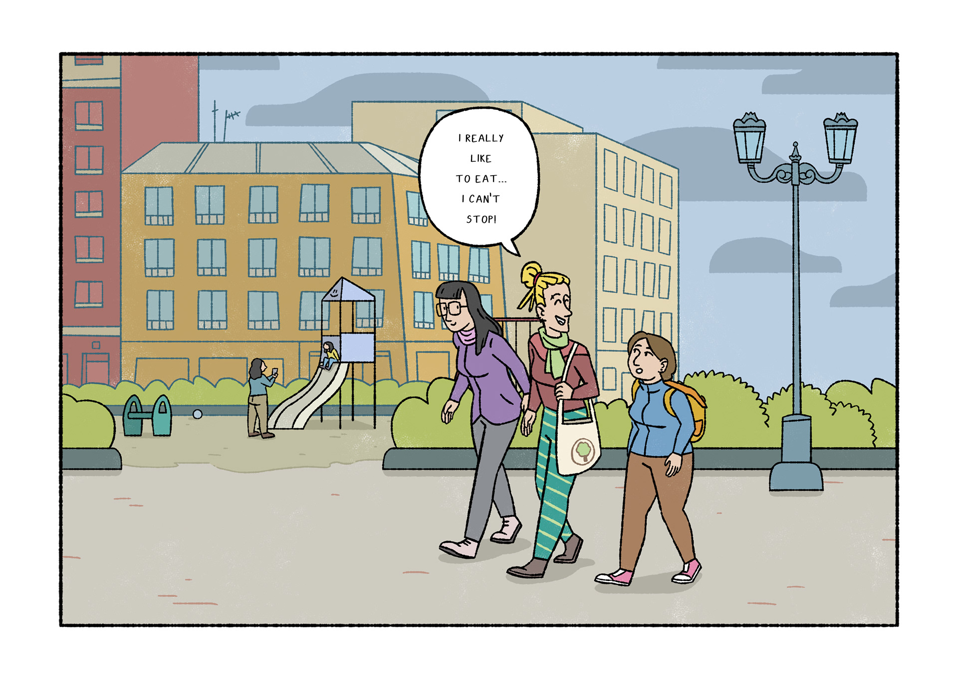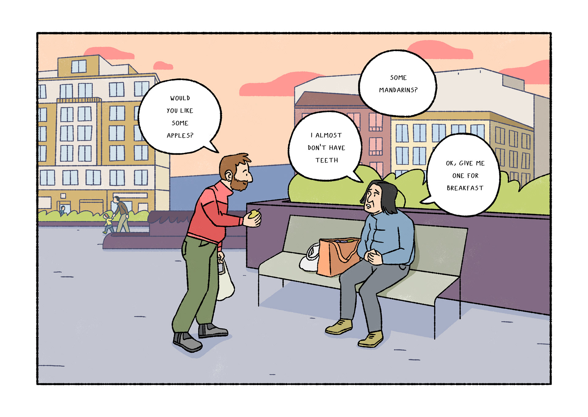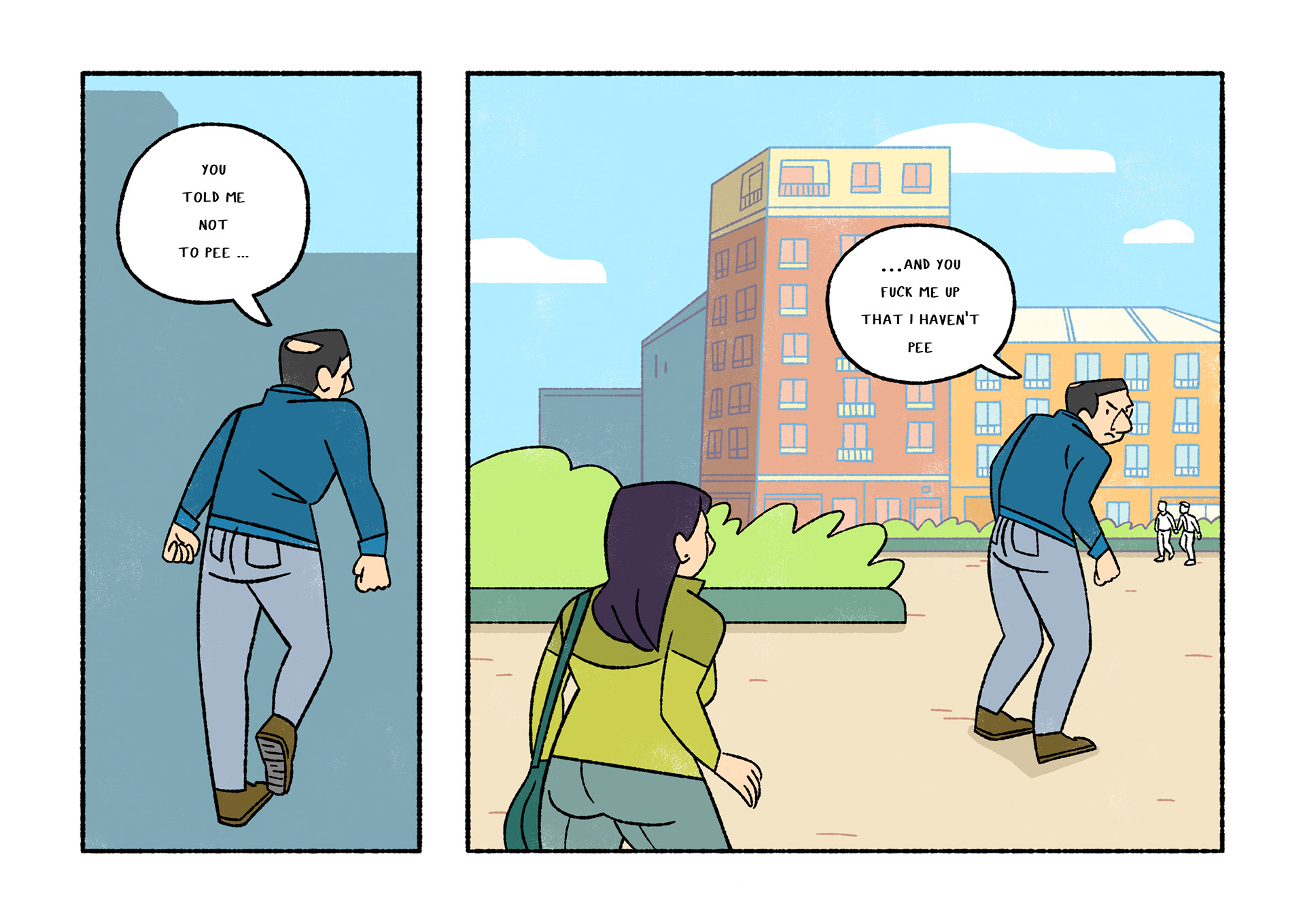 Olavide is a comic which portraits daily life. Each page shows a real conversation or sentence I listened on the street. After selecting 120 and chose Plaza de Olavide as the perfect scene, I started to draw them.
